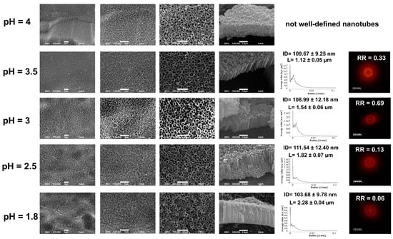 SEM micrographs demonstrating the impact of electrolyte pH on the structure of nanotubes. ID = internal diameter, L = length.
