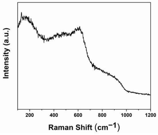 The Raman spectra for the TiO2 nanotubes produced using an electrolyte containing XG are shown in Figure 7; similar spectra may be seen in all samples. The Raman spectra show broad peaks at roughly 150, 450, and 600 cm−1; earlier investigations [,,,] have reported this spectrum’s form related to amorphous TiO2 nanotubes. From Figure 7, it can be concluded that employing XG does not result in the production of crystalline TiO2 nanotubes.