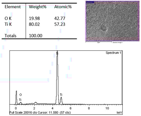 The chemical composition of the nanotubular layers was ascertained using energy-dispersive X-ray spectroscopy (EDX). Figure 8 shows the EDX spectra taken from the sample obtained using the electrolyte composed of 0.5 wt.% XG, 0.5 wt.% NaF, a pH of 3, and an anodizing time of 3 h. From Figure 8, it can be seen that the nanotubular layer was composed of titanium and oxygen; fluoride and carbon were undetected. From Figure 8, it can be concluded that employing XG does not result in composition changes in TiO2 nanotubes. In previous studies [,], the authors reported the presence of carbon residues in the nanotube layers produced with electrolytes such as ethylene glycol and glycerol.
