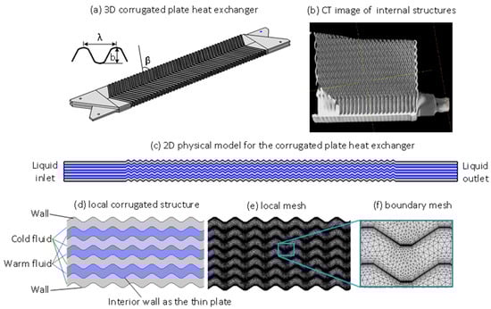 The corrugated plate heat exchanger, 2D physical model and meshes.