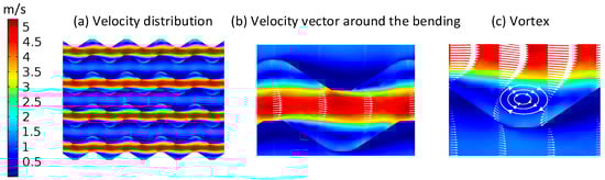 Furthermore, the velocities exhibit relatively higher values at the upper and lower walls of the bends compared to the adjacent layer. Figure 5b presents an expanded depiction of the fluid flow in the local region, revealing the presence of a clearly defined vortex surrounding the curved bending area, as illustrated in Figure 5c. The presence of these vortices leads to heightened velocities in the vicinity of the upper and lower walls of the bends, consequently augmenting heat transfer by facilitating the renewal of the boundary layer through the process of back mixing. The water system functions under a pressure of approximately 1.0 × 104 Pa, whereas the LN encounters a pressure decrease of 1.0 × 105 Pa.