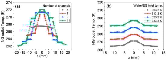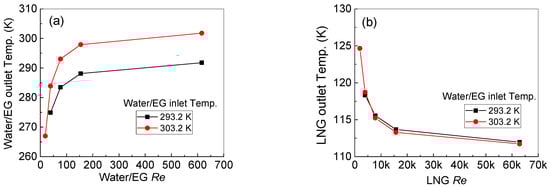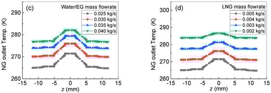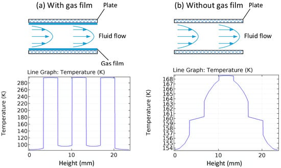 The simulation results revealed the presence of a thin gas film adhering to the plate, which was validated by comparing it with experimental values. The gas film has a thickness of approximately 0.2 mm and plays a crucial role in heat transfer. The top diagram of Figure 6a illustrates the location of this gas film. Conversely, when the gas film is absent, as depicted in the top diagram of Figure 6b, the outlet temperature of water deviates significantly from the expected values, as shown in Figure 6. The conditions for this scenario include a water flow rate of 0.005 kg/s, a water inlet temperature of 323.2 K, an LN inlet temperature of 77.4 K, and an LN flow rate of 0.015 kg/s. In the presence of the gas film, the water outlet temperature is 293.2 K, aligning closely with the experimental data (Figure 6a). However, without the gas film, the water outlet temperature drops to approximately 168.2 K, as depicted in Figure 6b, diverging from the actual observations. This discrepancy underscores the critical role of the gas film in mediating heat transfer between LN and water. The mechanism responsible for the formation of the gas film along the plate wall is yet to be fully understood. Possible explanations include (i) rapid vaporisation of LN upon initial heat transfer with water, leading to the formation of a gas film that impedes further heat transfer, and (ii) the formation of a gas film along the wall to maintain vapour equilibrium pressure. The precise factors influencing gas film formation warrant further investigation through experiments and simulations.
