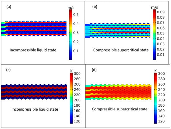 The validation experiment and simulation were performed utilising a system comprising LN and water. In order to obtain a deeper understanding of the fluid dynamics occurring within the corrugated plate, a computational simulation was conducted to visually depict the velocity distribution. The simulation encompassed a water mass flow rate of 0.164 kg/s and a LN mass flow rate of 0.492 kg/s. The water was initially introduced into the system with a temperature of 323.2 K, whereas the LN entered the system at a temperature of 77 K. Figure 5a depicts the velocity field, indicating that the central regions of the channels exhibit the highest velocities.