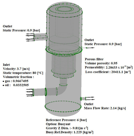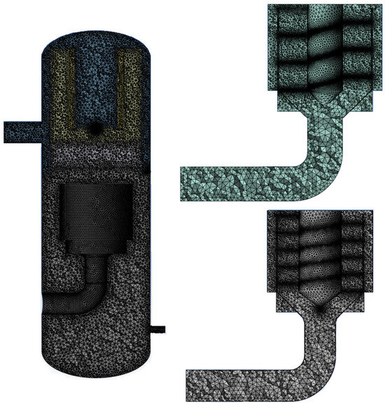 The calculation grid, shown in Figure 4, was generated using methods based on the maximum element size of 20 mm, generating calculation grids with 4,261,516 nodes and 11,906,316 elements. For local grid control, a sizing condition was applied, having the minimum element of 3 mm at the interface with the spiral and intermediate separator cylinder and for the surfaces of the demister and separator filter.