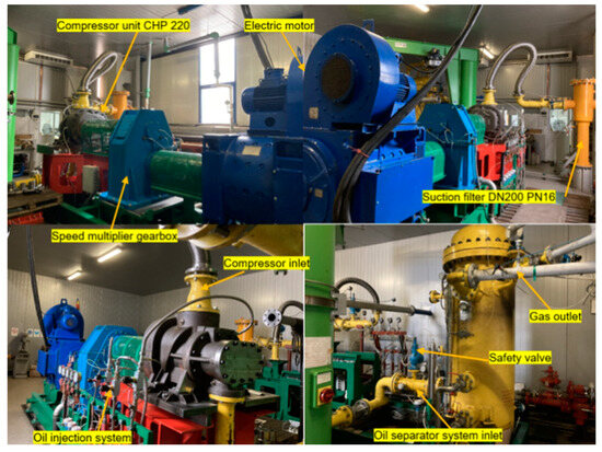 Numerical validation of the results was carried out on the test bench of a screw compressor test bench (Figure 5), which provides an excellent setting for conducting research and identifying the functional requirements and performance characteristics of the gas–oil separation solution. This test bench enables the manipulation of key functional parameters within a broad range, allowing for comprehensive investigations.