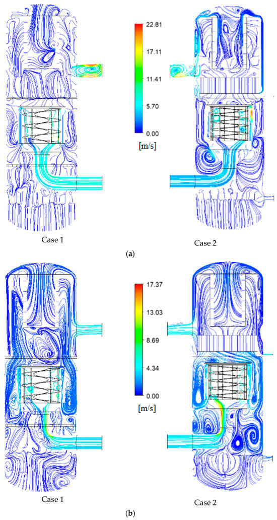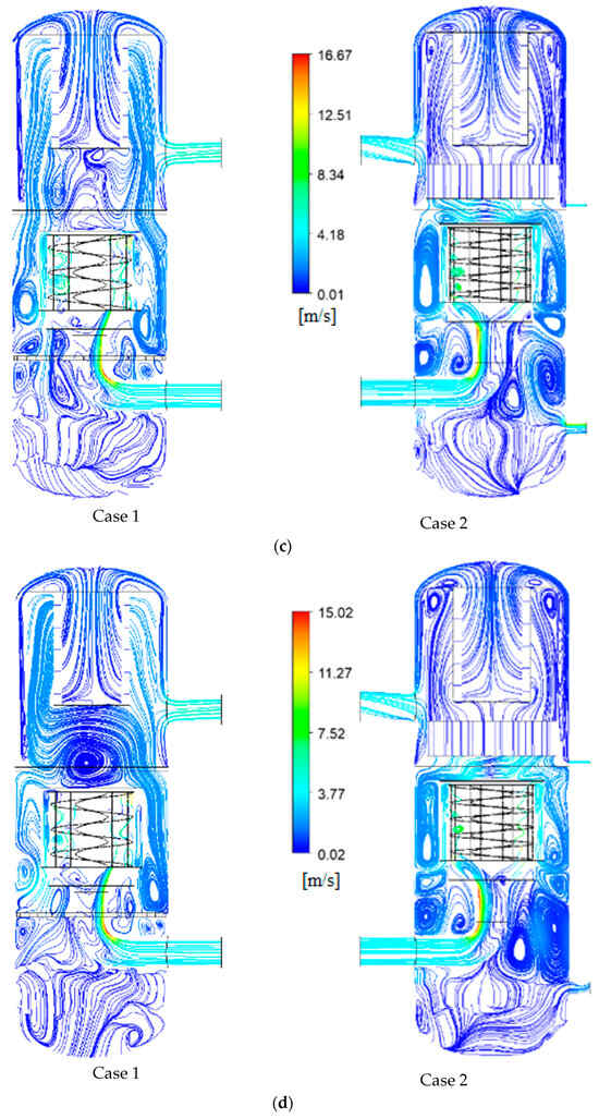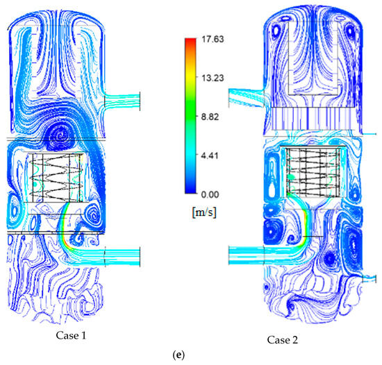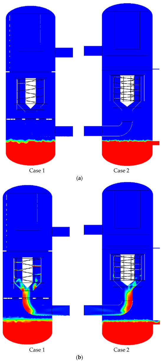 The streamlines for both situations are shown in Figure 7 for positions ranging from 0 s to 20 s. The oil–gas separator geometry is complicated; therefore, it has several recirculation zones that may be seen. However, because of the extremely low velocity, these zones have little impact on the separator’s effectiveness, with a pressure drop of less than 0.5 bar.