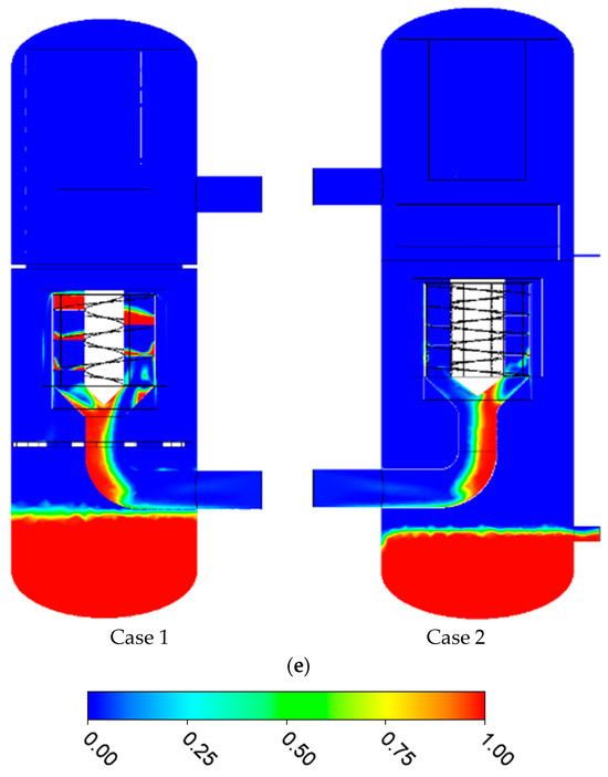 Due to the dynamic nature of fluid flows that may occur in the oil–gas separator, the oil volume fraction can change over time and space. For this reason, it is crucial to track and analyze how the volume fraction changes in different parts of the domain to comprehend the behavior of the multiphase system. The oil volume fraction for the two investigated examples is shown in Figure 8, and it can be seen that the high pitch of the inlet domain spiral increases separator efficiency by pushing the oil to the separator’s bottom through the spiral’s lateral gaps. Figure 8e demonstrates that in the second scenario, the oil falls gravitationally through the lateral gaps rather than ascending to the top of the spiral. When there is little oil at the top of the spiral, only a tiny portion of the oil makes it to the outlet after passing through two filters, which are represented by porous media.