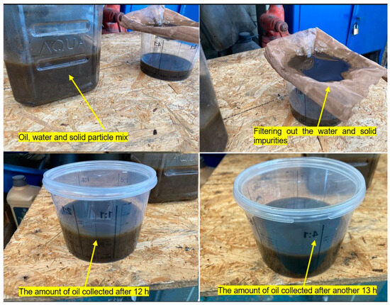 During the experimental phase, the liquid retained in the two collection compartments of the ASF400PN40 coalescer filter was collected twice, at 12 and 25 h of operation (Figure 10), respectively. The drained mixture consisted of a mixture of water, solid suspensions, and oil. The resulting mixture, which still contained a small amount of water, was filtered several times until only oil remained in the measuring vessel. The separation process was relatively difficult. It was expected that only the retained oil would flow into the collection compartments of the coalescer filter, but due to the low working temperature, water vapor from the compressed air condensed and settled on the pipes and bottom of the coalescer filter. The presence of water in the liquid state also caused iron oxide to appear in the compressed air paths, including in the collected mixture.