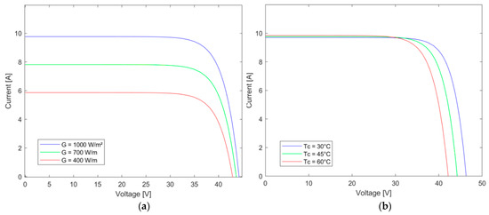 (a) Influence of irradiation on the I–V curve of a photovoltaic cell. (b) Influence of temperature on the I–V curve of a photovoltaic cell.