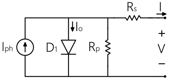 In the scope of modeling an equivalent circuit to obtain the best representation of a photovoltaic cell, a model with one diode and five parameters approaches the real configuration due to the inclusion of two resistances in the equivalent circuit, and (). The series resistance () encompasses two intrinsic resistances to the photovoltaic cell: the resistance of the semiconductor material in its P-N junction and the resistance between the material and the metallic terminals that capture the photogenerated current [25], while (), which is connected in parallel to the current source, represents the impurities and defects in the structure, mainly close to the edges, creating an internal path for the leakage current and reducing the current effectively generated by the device [25]. According to [34,35] the equivalent electrical circuit of the 1D5P model can be represented as shown in Figure 3.