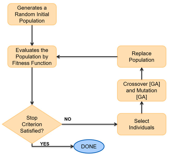 The genetic algorithm (GA) was developed by [36] and was considered an evolutionary algorithm paradigm [37]. Holland employed Charles Darwin’s evolutionary theory as an analogy for natural selection and reproduction processes, adapting these ideas to the computational environment. In this scenario, the element tasked with solving problems is called a chromosome or individual. Each chromosome contains M information, which represents the parameters to be later extracted by the algorithm. The initial step for applying the algorithm involves the generation of the initial population, executed in a pseudo-random way, adopting Np = 50 and limits specified in Table 1. Next, each individual generated is evaluated according to its aptitude (fitness), and the algorithm progresses according to the flowchart are outlined in Figure 4. In this path, the following operators are employed: GA Selection, GA Crossing and GA Mutation, as described in Section 2.4.1.2, Section 2.4.1.3 and Section 2.4.1.4, respectively. This recursive process lasts until Ng reaches a value of 3000. The choices of Np and Ng are supported by the parameter refinement process explained in Section 3.1.