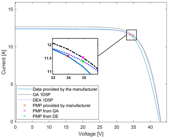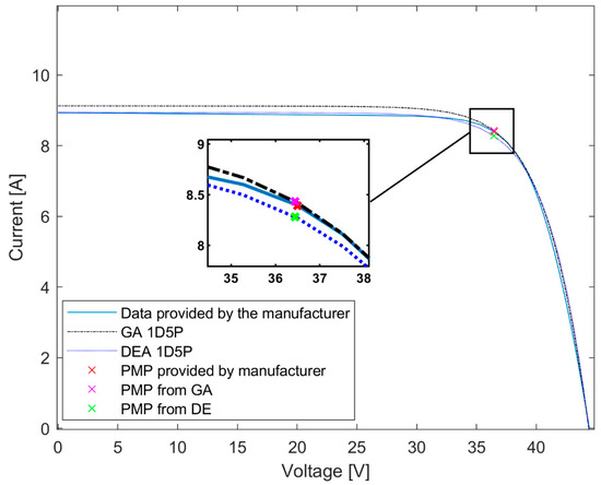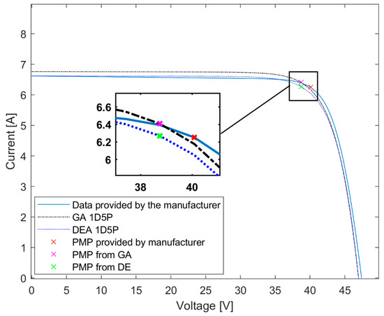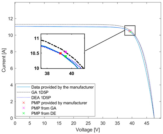 Superposition of the I–V curves generated by GA and DE in the 1D5P model under operating conditions G = 800 W/m2 and T ≅ 44 °C.