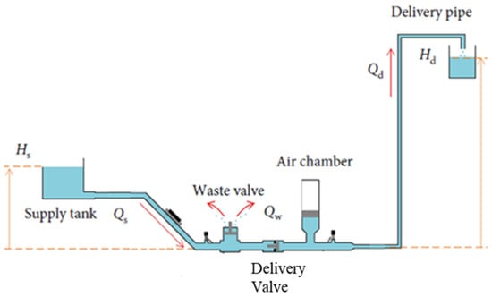 The conventional hydraulic ram pump (HRP) system operates through a series of well-defined phases, each contributing to its efficient and continuous operation. Figure 1 illustrates the fundamental components and arrangement of the conventional HRP system, showcasing the three operational phases: ‘acceleration’, ‘delivery’, and ‘recoil’.