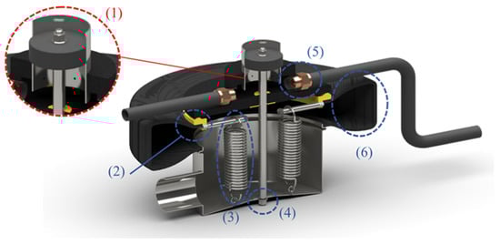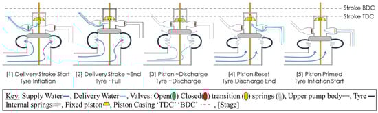 As can be seen in Figure 3, the system utilises a positive displacement piston arrangement with two separate upper and lower flow volume chambers to transfer and amplify the dynamic tyre pressure into the elevated head pressure. Then, a series of relative strokes are generated using a fixed length piston to deliver a secondary supply of water against the elevated head, which is understood through five operational phases (1–5), as follows [8]: