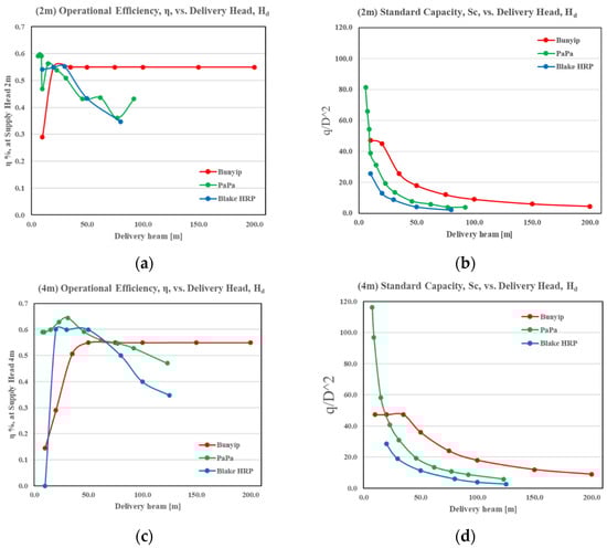 The Bunyip pump can operate at a reduced supply head, as shown in Table 1 (note: a consultation has been made with the associated Bunyip team for application at or less than 1 m for the two HRP designs to verify this). Additionally, the figures given in Table 1 for the HRP demonstrate that it has better effectiveness than the HRP in the lower region of Figure 5a,c at approximately a 15 m delivery head. The Bunyip pump in principle provides a significantly greater capacity to deliver to greater ranges for the equivalent supply, illustrated by the extended line lengths in Figure 5, attainable through its pressure-amplified positive displacement design. Clearly, this establishes the Bunyip pump as the only system that can operate to greater heads than 100 m, and it is even reported to operate up to 432 m in an adapted reinforced cylinder model currently under development.