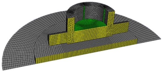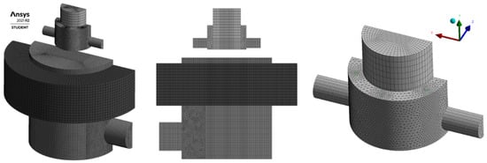 The developed model is discretised using the integrated Ansys meshing module. This enables a suite of meshing tools to utilise the previously highlighted edges in fluid zones to assign meshing controls. Namely, the application of edge, face, and body sizing in conjunction with both structured sweep and couple compatibility regions of tetrahedral elements to maintain high mesh quality could facilitate the dynamics of the domain. For the study, a development mesh is utilised, opting for a nominal mesh size of 5 mm across the core areas and 10 mm in zones within dynamic regions, as shown in Figure 8. This is to compromise within the Ansys licence capacity and trade-off time step size across relatively extended transient simulations ~2–4 s at 0.005 s. The upper and lower regions of the system occupy separate volumes and utilise cylindrical structures comprising a square face surrounded by an anulus of sections. This can be recognised to maintain quality in central regions, particularly in the aspect ratio. A prospective mesh sensitivity test was conducted. To maintain layers’ successful operation and avoid negative cell volumes due to the implicit layering approach, the time steps have also been adjusted.
