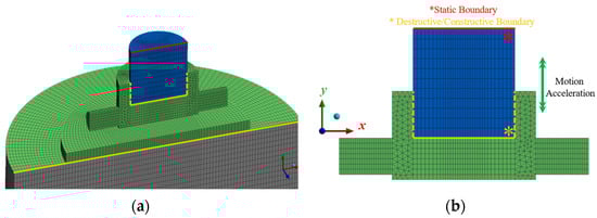 In Figure 9a,b, we illustrate the dynamic zones established to describe the operation in the upper chamber. In this case, the relative power and reset stroke of the piston could be defined by setting the piston as static, which is depicted in blue. The upper piston surface could be defined as static, and the foot could be set as a rigid body (RB) dynamic zone with established solution stabilization and meshing options set for the adjacent boundary, indicated in orange. This could be defined in parallel for the lower region on the lower ‘roof’ of the tyre. The orange and green regions could then be set in RB motion through the application of a designed UDF profile. This enables the internal tyre and piston region to extend and contract to represent the changes in the domain. This required the definition of over 60 dynamic zones, including interiors, boundaries, and volumes, as depicted in Figure 10.