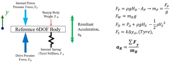 The second method uses a multi-body physics solver with the capacity to define the internal physics through the individual definition of the mass and stiffness properties of the system. For the Bunyip application, a free-body diagram is illustrated, as shown in Figure 11, to introduce the primary forces considered within an operation. For the given case in study, the internal pressure in the piston is calculated as an equivalent hydrostatic pressure ‘mass’ and defined through the 6DOF properties in addition to the Bunyip body mass of 5.6 kg. This will be directly applied during the power stroke and removed using a UDF during the reset phase [14]. In addition, other properties can be defined; for example, the internal spring stiffness can be implemented at 700 N/m across a constrained stroke length of 90 mm. At this time, we ignore the tyre stiffness due to its non-linear properties and multi-dimensional characteristics as well as additional losses due to friction. The solver enables internal equilibrium equations incident on the internal flow forces at the base volume of the tyre to be calculated, referenced centrally to the upper tyre surface. The result, similarly to the UDF, mapped across the domain relative to the surrounding green cell zones, as illustrated in Figure 9 before.