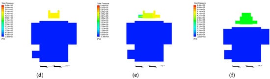 Firstly, to illustrate the ‘free’ hydro-power cycle in principle, the propagation of the total internal pressure within the domain could be plotted globally to indicate the associated values relative to the total cycle. This additionally provides an opportunity to review the initial flow mechanics alongside a series of vector and magnitude illustrations, again using graphics to aid an internal investigation of the Bunyip mechanism. Figure 13 describes the process from motion initiation to upper piston compression and delivery. In Figure 13d,e, the discharge features release the upper piston to a reduced pressure for the motion to reset.