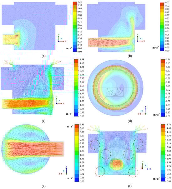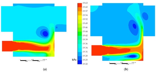 The above operational process visualisation can also be enhanced through the application of the definition of internal planes to enable enhanced visuals of the relative quantities and better illustrate the internal flow, set apart using local and global pressures and velocity scenes. In this case, the rotation and mixing induced by the abrupt changes in the inlet geometry in Figure 14a,b are better described. The plots illustrate the complex dynamic nature of the chamber and the turbulent incident flow.