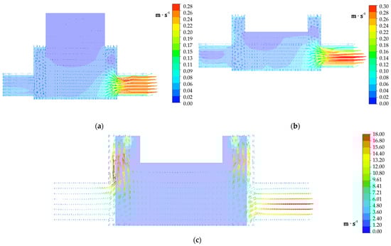 Velocity contours in the upper piston stroke and discharge regions, illustrating the transient motion vectors at different time instants for (a) delivery stroke at 0.1 s; (b) water delivery as piston approaches BDC of the power stroke at 1.875 s; and (c) waterflow accelerates from the domain to the three exhaust points at 1.91 s.