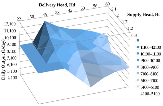 The previously discussed series of real-world systems provide the opportunity to observe the influence of supply and delivery performance. The data collected and calculated using the numerical model are used to produce a three-dimensional surface plot (see Figure 17). This visual representation uses the analysed cases to begin building an indication of how the supply and delivery heads in combination may influence the daily output and proportional operational performance of the pump. Importantly, note that the lower delivery head regions, we assign an average capacity of 8600 L/day to illustrate the surface floor average. In many of the cases away from our inspected data points, it is recommended to adopt a smaller Bunyip PA-8. Generally, such unique cases and data are not available in low-end performance systems either. At the given supply rate, the trend within the current dataset indicates that, as expected, with an increased supply head, the Bunyip pump can access improved daily output. Meanwhile, the ability to connect the two variables again indicates that for the typical 2 m average tested, the greatest accessible performance capacity would be at a ~32 m delivery.