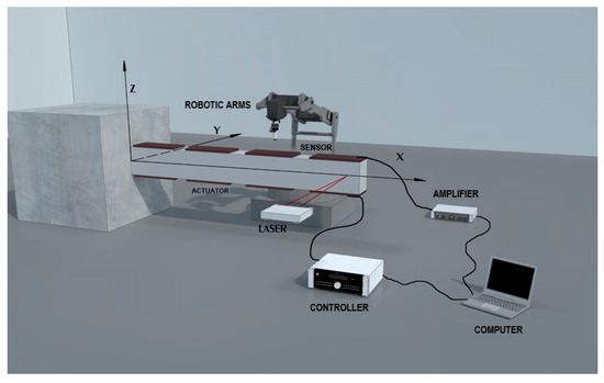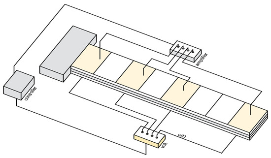 Additionally, to define fe(t) as Bu(t), we express it as , where (of size 2n × n) is the piezoelectric force for a unit applied on the corresponding actuator, and u stands for the voltages on the actuators [40,41,42]. Lastly, d(t) = fm(t) is the disturbance vector. Then,