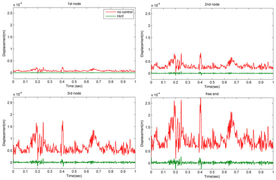 Displacements for the four nodes with actuators. The green line is with H-infinity control (closed loop), and the red line is without control (open loop).