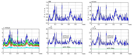 Figure 6 shows the beam’s displacement over time as a result. In comparison to when there is no control, the displacement is almost zero. We were able to minimize vibrations by 95% by employing a unique control technique called H-infinity control. The green line is with H-infinity control (closed loop), and the red line is without control (open loop). Suppression of oscillations is achieved in all actuators and displacements are almost zero. This is very important in all mechanical constructions and a real innovation. At the same time, as shown in Figure 7, a relatively low voltage is achieved in the actuators since the suppression is done with approximately 50 Volts while the actuators withstand 500 Volts. As shown in Figure 7, the voltage generated by the control system to operate the control is within the 500 Volt safe limit for the material being utilized. The blue line shows the voltages of the last node, the green of the previous one, the red of the second, and the pale blue of the first node.