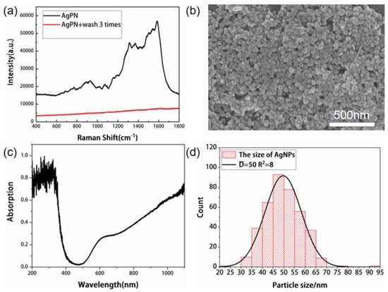 (a) Raman spectrum of Ag NPs before and after water washing. (b) SEM image of Ag gel by microwave method. (c) Absorption spectrum of Ag gel using the microwave method. (d) Statistical graph of particle size distribution of Ag gel.
