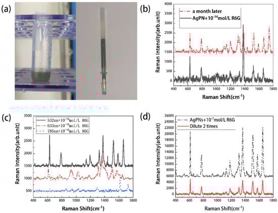 The Ag NPs gel pen (Figure 2a) was stored at 4 °C for one month, and then the Raman spectrum test was conducted. The Raman spectra was shown in Figure 2b. The enhancement effect of the Ag gel pen on R6G was almost unchanged, indicating that the Ag gel pen had a good preservation effect. In order to select the laser wavelength with the best SERS effect, the spectra of R6G on air-laid paper at 532 nm, 633 nm, and 785 nm were detected, as shown in Figure 2c. The 532 nm laser wavelength had the strongest enhancement effect on the sample, followed by 633 nm, while the Raman peak of the sample was almost invisible at 785 nm. Therefore, the laser wavelength of 532 nm was used in this experiment. Meanwhile, as shown in Figure 2d, by comparing the SERS effect of undiluted high-concentration Ag gel and Ag gel diluted twice with deionized water on 10−7 mol/L R6G, we found that high-concentration Ag gel had a better enhancement effect, so high-concentration Ag NPs were used for the experiment.