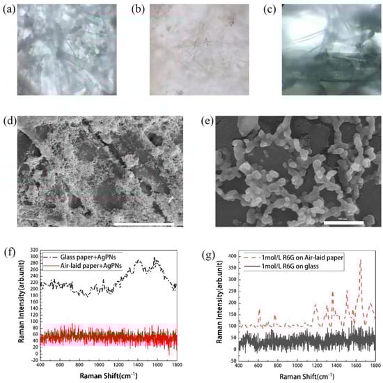 Optical images of different types of paper substrates are shown in Figure 3a–c. Both types of paper are composed of dense paper-based capillary fibers, with glass fibers exhibiting finer filaments. From the SEM images of Ag NPs on the papers, as shown in Figure 3d,e), the Ag NPs on the paper-based fiber was random distributed and fill in the gaps in paper materials. The laser beam can penetrate the paper materials and Ag NPs gel, and optical excitations are used to produce higher SERS EF []. For dust-free paper and glass fibers, we tested our own Raman peak using a silver glue pen. As shown in Figure 3f, it can be seen that no results from this paper have a sharp Raman peaks, indicating that the SERS substrate has no noise interference and is excellent substrate material. According to the comparison in Figure 3g, the SERS-EF of paper-based materials is significantly higher than those of the capillary tubes and slides commonly used in the laboratory. We can see that in the absence of the silver glue enhancement, the dust-free paper can detect 1 mol/L of R6G compared with the glass sheet, proving that the loose and porous paper-based material of the dust-free paper can help in SERS signal enhancement. The loose and porous structure of the paper-based material is conducive to the enhancement of the SERS signal. At the same time, the paper-based material does not interfere with the noise of the sample molecules. We believe that the paper-based material is an excellent material for making the SERS substrate.