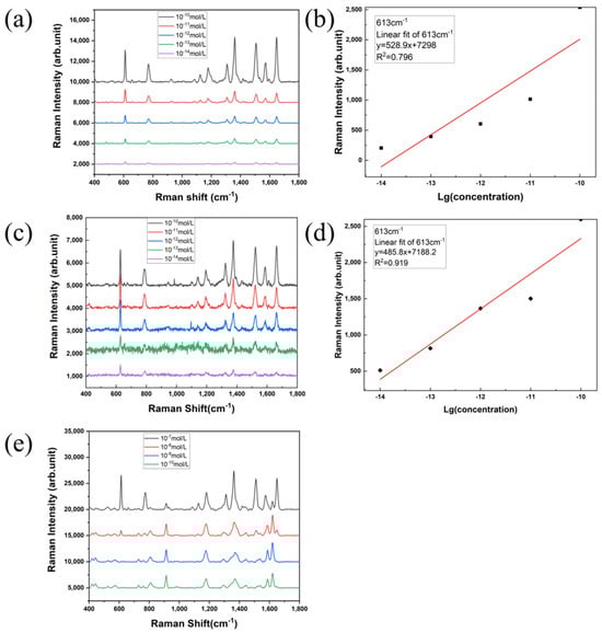 (a) Raman spectrum R6G detection limit of glass fiber. (b) Fitting curve of R6G concentration on glass fiber. (c) Raman spectrum R6G detection limit of air-laid paper. (d) Fitting curve of R6G concentration of air-laid paper. (e) R6G detection limit Raman spectrum of A4 paper.