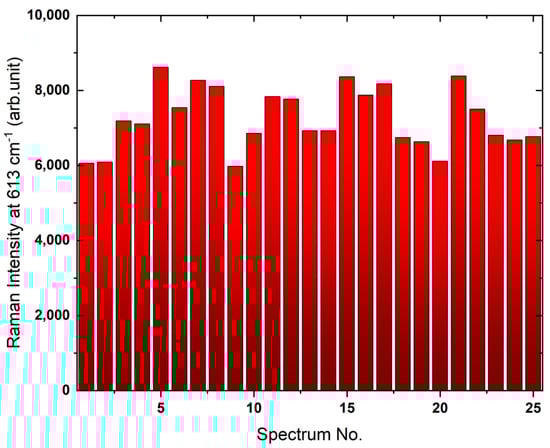 The signal uniformity can be obtained with the relative standard deviation (RSD). The reproducibility test results of paper-based SERS signal are shown in Figure 5, and the RSD of Raman intensity at 613 cm−1 was 11.13%, which was better than the effect seen in some published articles []. We can draw the conclusion that the particle size distribution on the surface of the air-laid Ag NP paper is evener than that of the air-laid paper substrate with good reproducibility. Therefore, as the paper test method in this paper is very simple and fast, and the paper base material is very simple and cheap to use, disposable SERS base material is used for the paper base SERS. So, we do not need to test its stability. Therefore, the stability of paper SERS sensors depends on the stability of Ag NPs. The above paper has demonstrated that silver glue pen can store Ag NPs well for more than one month, so the stability of the paper-based SERS sensor discussed in this work is more than one month.