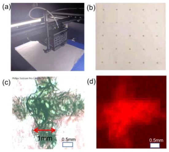 Figure 6a is the photo of 3D printer and SERS platform. The Ag NPs gel pen and 3D printer were combined to create the SERS array. The handwriting width is about 0.3 mm, the pattern can be designed using the printer’s code program, and thus the mapping test was carried out. Figure 6b shows the 5 × 5 SERS array printed on 16 cm2 A4 paper. Raman detection can be performed on the samples by dropping the sample solution onto the silver gel pattern points. Therefore, this design can test a large number of samples at one time. WIRE4.4 software was used to map and scan the cross-stars. Step sizes were 100 microns in both x and y directions. The Raman spectra of R6G at every point on the whole cross-star were scanned in this research. In the process of data processing, the data intensity of the Raman peak at 613 cm−1 in the Raman spectral data of each point is selected to represent the intensity of the whole Raman spectrum. Figure 6c is the optical image of a single point in the array, represented by the Raman signal intensity at 613 cm−1. The mapping diagram is shown in Figure 6d. The signal in the pattern area where the Ag gel is located is bright and red. The precision of the patterns drawn by this method can reach sub-millimeter accuracy (0.3 mm), and the patterns can be recognized in the mapping diagram. Therefore, it can be considered that high-precision SERS array mapping can be performed using 3D printers. Based on this, I can conclude that printing other SERS patterns is completely feasible. In conclusion, this paper enables SERS templates to print with low cost, high sensitivity, neat arrangements, and high accuracy using a 3D printer. The volume, concentration, and water content of the NPs at the SERS point on the high-precision SERS template are the same, which is conducive to the standardization of SERS substrate and the reproducibility of the SERS substrate.