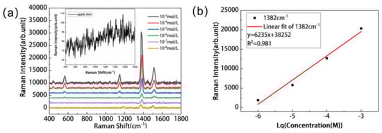 The purchased 80% thiram were prepared into thiram solution with effective concentrations of 1 × 10−3, 10−4, 10−5, 10−6, 10−7, and 10−8 mol/L, respectively. We applied the pesticide solution of standard concentration on the peel. After the pesticide was dried, we wiped the position of pesticide residue with the weight paper treated with the pen, and then conducted the Raman spectrum test. The minimum detected pesticide residue of formicide was 10−8 mol/L (as shown in Figure 7a), which is lower than the China national standard (GB 2763-2012) [] of 2.435 × 10−6 mol/L and the European standard of 9.74 × 10−7 mol/L (European Community, Commission Directive 2007/57/EC) []. So, the detection method is effective and feasible, and the time from sample preparation to data processing can occur within 30 min, is efficient and simple, and can be used for on-site real-time detection. Figure 7b shows a linear relationship between the log value of formic double concentration and the intensity of Raman spectrum.
