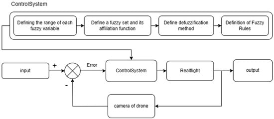 A fuzzy controller was employed to control the drone’s direction based on the position of a desired object. We opted for the fuzzy controller because, unlike other controllers such as PID and linear controllers, it does not require knowledge of the system model. The construction of a fuzzy controller can be easily achieved by leveraging human knowledge. The motor can be easily directed toward an object using fuzzy logic [] by defining simple rules and incorporating variables from the preceding stages of the pipeline. While fuzzy logic might show a less optimal performance compared to a neural network controller, its advantage is its minimal resource consumption in drone control. This characteristic is indispensable for embedded systems with limited computational resources. Figure 3 shows the fuzzy control system block. Initially, the system takes the error between the detected target and the center point as the input. Subsequently, the fuzzy system calculates the angle at which the motor rotates. Subsequently, the system recalculates the error based on the camera on the drone and returns it as feedback. This loop continues until the drone enters the target.