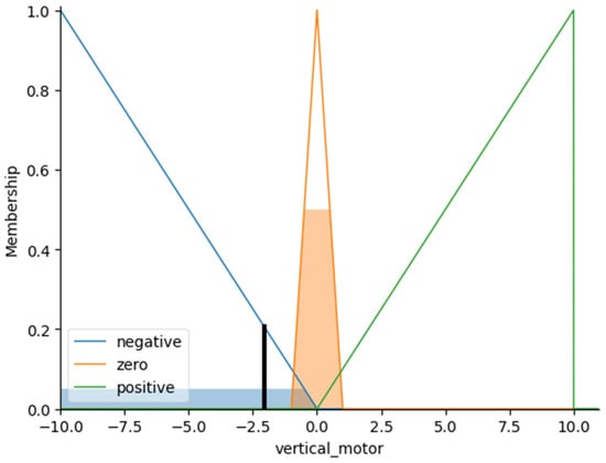 For example, when the vertical error is 0.5, based on the fuzzy sets and fuzzy logic defined earlier, we obtain a fuzzy decision, as illustrated in Figure 5. Subsequently, by employing the CoG method from Equation (2), we derive the following integral Equation (3). Solving this equation yields x as −2.06137703781. This implies that the fuzzy controller will adjust the drone’s camera downward by −2.06137703781 degrees.