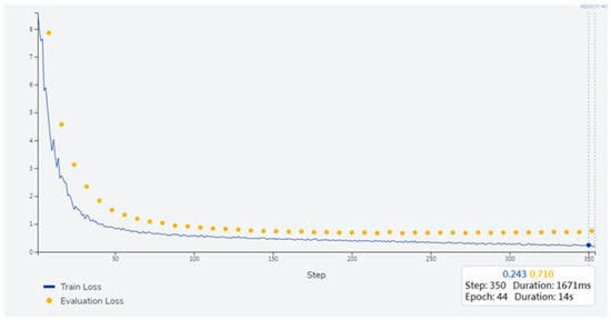 Transfer learning typically requires fewer computing resources and less time because it only needs to train the output model. However, using the knowledge learned in the pretrained model may not be feasible; thus, optimal performance may not be achieved. The losses for training and evaluation are shown in Figure 6. The training parameters are as follows: