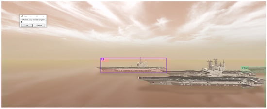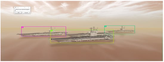 We initially used the SSD MobileNet V2 to detect three aircraft carriers, each of which was assigned a unique ID using DeepSORT, as shown in Figure 9. Upon selecting Target ID 2 from the dialog box, we seamlessly transitioned the object-tracking method from SSD MobileNet V2 and DeepSORT to CSRT, which is a single-object tracker. Simultaneously, the fuzzy controller was engaged to ensure the precise navigation of the drone toward the aircraft carrier associated with ID 2, as shown in Figure 10. As shown in Figure 11, the entire process converges after approximately 15 iterations, and each fuzzy controller output takes approximately 0.1 s. Although the drone experienced minor shaking during this adjustment, owing to the controller’s sensitivity, it effectively completed the process within an impressive 1.5 s. Furthermore, once the drone aligned with the target, we promptly halted the tracking process and selected a new tracking target, demonstrating the drone’s ability to seamlessly change targets and align with the new target within 1.5 s. These results demonstrated the practicality and effectiveness of the proposed method.