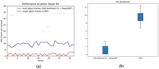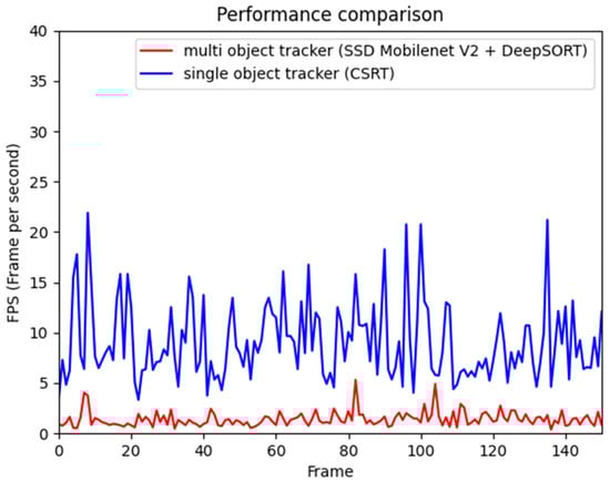 We further evaluated the performance enhancements achieved by transitioning from an MOT (SSD MobileNet V2 + DeepSORT) to a single-object tracker, CSRT. A comparison of the number of FPS is shown in Figure 12.
