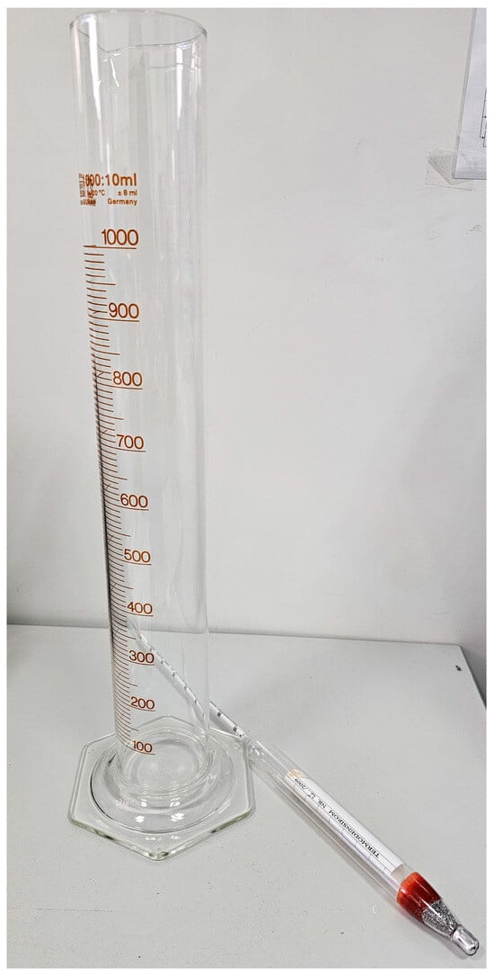 Densities of: Jet-A fuel, obtained from pork fat and all the tested fuel blends were measured as described in SR EN ISO 3675/2002 [38]. The testing equipment is comprised by glass cylinder with gradations and thermo dens-meters manufactured by Termodensirom SA, Bucharest, Romania and shown in Figure 1.