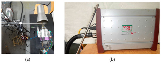 Figure 7. The stand tests for gaseous emissions: (a) the placement of the probe for gaseous emissions and (b) MRU Vario Plus Analyzer.
