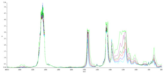 The FTIR for all samples was experimentally determined using a (FTIR) Spectrum Oil Express Series 100, v 3.0 spectrometer provided by Perkin Elmer—Romanian representative, Tancabesti, Romania (Figure 5) and with dedicated software for all the fuel blends.