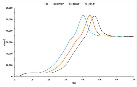 This section presents the outcomes of the initial phase of the micro turbo-engine, focusing on the starting procedure. The starting regime is defined as the duration from the initial starter movement to the point where the engine achieves a stable operational state. The primary objective is to evaluate the stability of the starting process for different fuel blends. Figure 9, Figure 10 and Figure 11 illustrate the variations in engine characteristics during this phase, including rpm vs. time, fuel temperature vs. rpm, and fuel flow rate vs. rpm. These visual representations provide insights into the dynamics and performance of the engine during the critical starting period for each fuel blend.