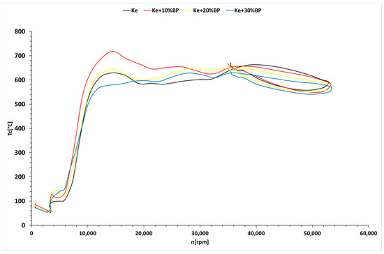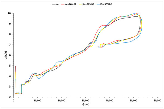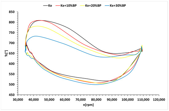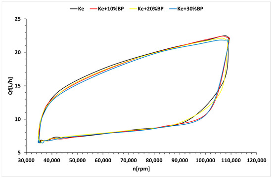 Figure 11 shows that the fuel debit needed for the starting procedure increases while the biodiesel concentration increases. This is due to the fact that the starting temperature for Ke is higher than the starting temperatures of the fuel blends; therefore, the engine is forcing a large amount of fuel within the burning chamber in the case of Ke. After the working temperature is reached, the fuel debit variation is switched (lower for Ke and higher for fuel blends). So, during the “cold” period of the starting procedure, Ke debit is higher than the fuel blend ones and after the working temperature is reached, Ke debit is lower than the fuel blend ones.