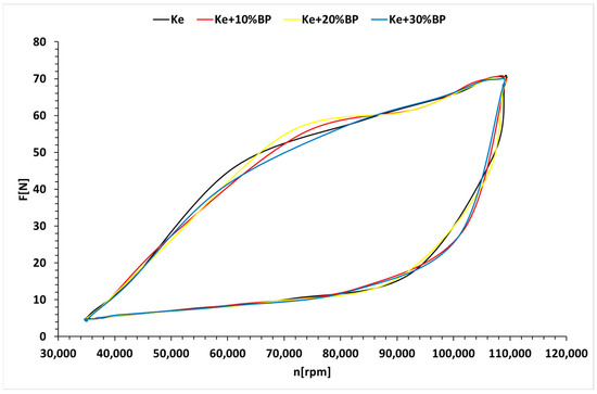 The investigated fuel blends consist of kerosene with varying percentages of biodiesel 10% (BP), 20% (BP), and 30% (BP) and with 5% of Aeroshell 500 oil added to each blend for engine lubrication due to the fact that such a small engine does not have its own lubrication system. The tests were conducted under three distinct operating regimes: idle (18.7% throttle gas), cruise (30% throttle gas), and maximum (94% throttle gas for safety functioning). Each regime was subjected to a testing period of approximately 2 min, during which engine parameters were closely monitored. The measured parameters included temperature (Tcomp) after the compressor, temperature (Tcomb) before the turbine, fuel flow Qf, air flow, pressure in the combustion chamber, and thrust (F). The turbocharged engine maintained a constant shaft speed throughout the experiments, unaffected by the different fuel blends. However, to sustain this constant shaft speed, the fuel blends were introduced into the combustion chamber in varying proportions. Despite the variations in fuel blends, the compressor operated at a consistent speed, resulting in uniform pressure after the compressor and consistent air flow. Comparative assessments were made for parameters such as consumed fuel flow (Qf), temperature in front of the turbine (Tcomb), and thrust (F) under conditions of constant shaft speed.