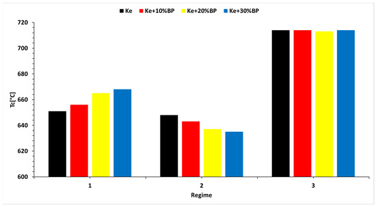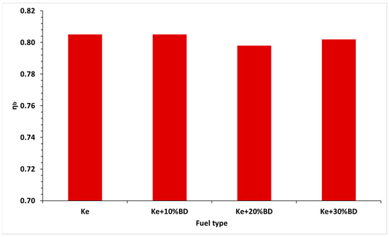 The quantity of CO2 resulting from the stoichiometric combustion reaction with air varied from 3.12 kg per kilogram of fuel when only Ke was used. When 10% BP was added, the value decreased to 3.09 kg; for 20% BP, it further reduced to 3.05 kg; and with 30% BP, it reached a lower value of 3.04 kg.