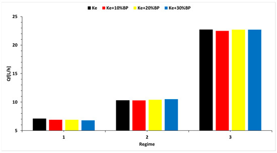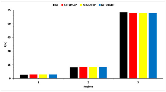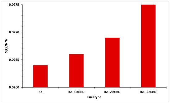 For regimes 2 and 3, the temperature in front of the turbine decreases with the increase in biodiesel concentration, and the fuel flow rate increases with the increase in biodiesel concentration. This is reflected in the increase in specific consumption. For regime 3, an increase in specific consumption was observed from S = 0.0264 kg/Nh when the turbo-engine operates only with Ke; for Ke + 10% BP, S = 0.0266 kg/Nh; for Ke + 20% BP, S = 0.0269 kg/Nh; and for Ke + 30% BP, S = 0.0275 kg/Nh.