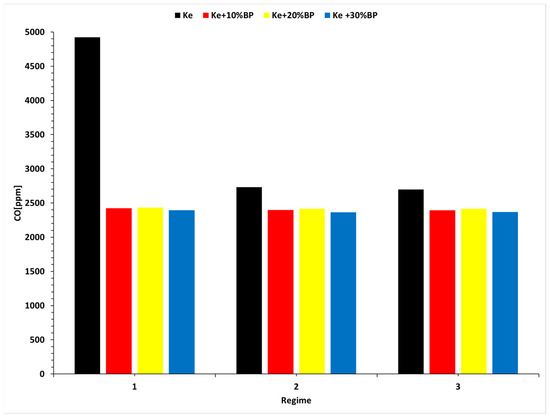 Regarding the CO concentration in gas emissions, there is a decrease in concentration for each regime with the increase in biodiesel concentration. Thus, in idle mode, the CO concentration for Ke was 4921 [ppm], in regime 2, it was 2731 [ppm], and in regime 3, it was 2697 [ppm]. When 10% BP was added, for Ke, it was 2422 [ppm] in regime 2 and 2396 [ppm] in regime 3. When 20% BP was added, for Ke, it was 2433 [ppm] in regime 2 and 2415 [ppm] in regime 3. Finally, when 30% BP was added, for Ke, it was 2394 [ppm] in regime 2, 2364 [ppm] in regime 3, and 2360 [ppm] in regime 3.